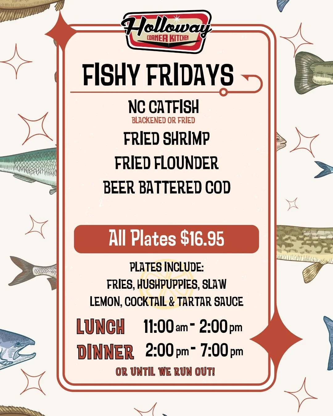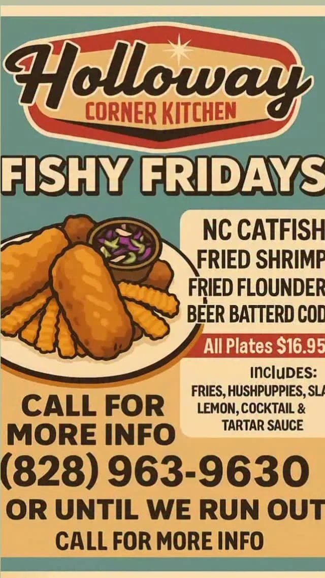 HollowayCorner Kitchen 8937 NC 105 SFoscoe, NC *Est. 2024*DINE IN >> CARRY OUT Call 828-963-9630 HOURS7am - 2pm Mon-Fri8am - 2pm Sat-SunBreakfast Hours7 - 11am Mon-Fri 8am - Noon Sat-Sun BREAKFAST MENU LUNCH MENU BUY GIFT CARDS catering/tailgating menu EVENTS Saturday night is Pizza Night at the Corner. TAKEOUT ONLY from 4:30-7pm (or until we run out). Call 828-963-9630 to order! Seafood plates are served TAKEOUT ONLY from 2-7pm. Call 828-963-9630 to order!