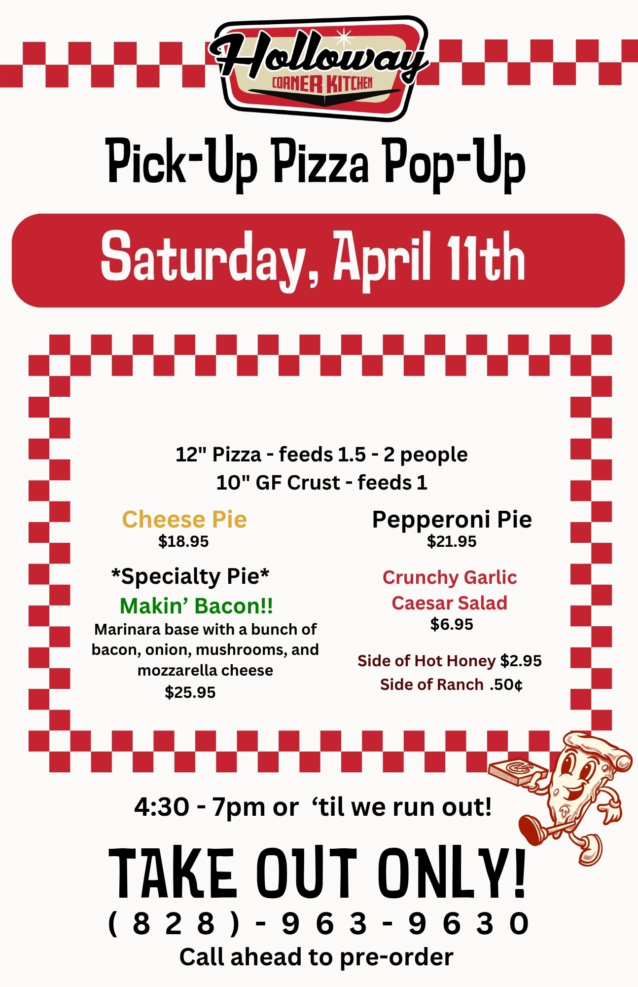 HollowayCorner Kitchen 8937 NC 105 SFoscoe, NC *Est. 2024*DINE IN >> CARRY OUT Call 828-963-9630 HOURS OF OPERATION 7am - 2pm Mon-Fri8am - 2pm Sat-SunBreakfast Hours7 - 11am Mon-Fri 8am - Noon Sat-Sun BREAKFAST MENU LUNCH MENU BUY GIFT CARDS catering/tailgating menu EVENTS Saturday night is Pizza Night at the Corner. TAKEOUT ONLY from 4:30-7pm (or until we run out). Call 828-963-9630 to order! Seafood plates are served TAKEOUT ONLY from 2-7pm. Call 828-963-9630 to order! We serve coffee from the High Countryās finest roasters! Drip - Espresso - Latttes - Nitro Cold Brew and lots more⦠Feeding a crowd? Let us help! Follow us on the Gram or Facebook for announcements, specials and the latest from Rough Ridgley